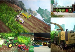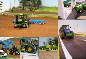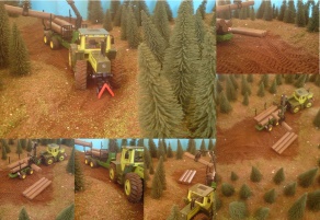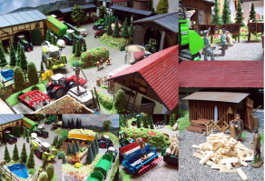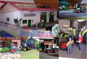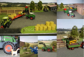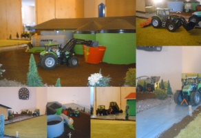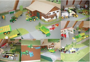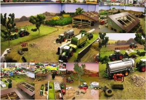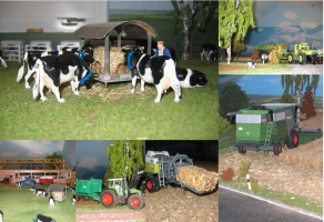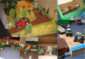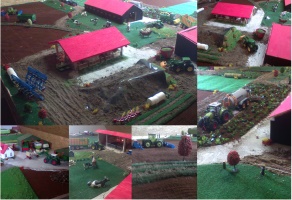 |  | Mein Diorama ist ca. 10 qm² groß und enthält mehrere Aspekte der modernen Landwirtschaft. Es gibt ein großes Lohnunternehmen, mit großen Hallen, einem Wohnhaus und entsprechenden Maschinenpark, einen Landmaschinenhändler mit Werkstatthalle und eine kleine Kelter. Ein Wald ist ebenfalls vorhanden in dem typische Waldarbeiten wie z.B. Holz rücken dargestellt werden können. Auch ein Weinberg, eine kleine Koppel/Weide und eine kleine Obstanlage finden sich auf dem Diorama. Insgesamt gibt es eine große Grünlandfläche und 6 Felder (zum Teil Kaffeesatz), davon ein Maisfeld. |
