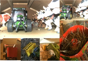 |  | Ich heiße Lennart und bin 13 Jahre alt. Dieses Diorama wurde innerhalb von einem Monat gebaut. Es besteht aus einem Milchviehbetrieb mit 72 Kühen. Neben dem Hof ist auch Raiffeisen, wo gerade mächtig gearbeitet wird! Natürlich wird bei mir auch in der Nacht Silage eingefahren. Vor dem Stall wird eine Kuh vom Landtierarzt behandelt. Hinter dem dem Hof ist auch eine Biogasanlage! Mein Onkel ist Bauer in Ostfriesland und bewirtschaftetet einen großen Milchviehbetrieb mit etwa 100 Kühen. Meine Ferien verbringe ich gerne dort. |