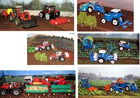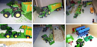 | Im Alter von 35 Jahren habe ich Ende 2006 zusammen mit meinem kleinen Sohn das Interesse für Landmaschinen und meine alten BRITAINS Modelle (wieder-)entdeckt. Dabei entstand der Wunsch, das Flair der Hintergrundbilder in den alten BRITAINS-Verpackungen in Form austausschbarer Dioramen von je 30 x 60 cm Größe in einem Hochregal umzusetzen; denn für große Landschaften fehlt der Platz. Bei den kleinen Szenarien sollen die eingesetzten Landmaschinen für den Betrachter im Vordergrund stehen. Einen thematischen Schwerpunkt habe ich hier auf den Kartoffel- und Karottenanbau gesetzt. |