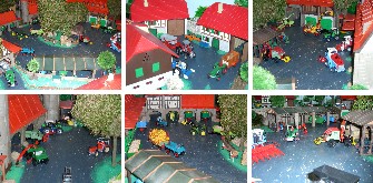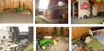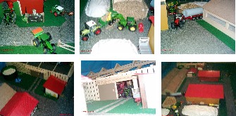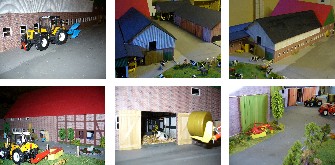 | Wir vier (alle zwischen 12 und 16 Jahre alt) haben in den Osterferien innerhalb von 4 Tagen ein Diorama gebaut. Das Diorama hat eine Größe von ca. 9 m² und ist in einer U-form gebaut, und steht auf dem Dachboden. Wir haben ca. 2 m² Grasteppich, 1l graue Farbe, 2 m² Ackerfläche (Kaffesatz) und ca 1 m² Kornfeld (Kokosmatte). Das Diorama ist in Hof und Lohnunternehmen unterteilt. Der Hof hat einen Boxenlaufstall, einen Maschinenschuppen und eine Biogasanlage. |