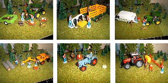 | Mein Name ist Jann-Hendrik (26 Jahre). Die folgenden Bilder entstanden auf meiner Dioramenplatte (Größe 51x39cm) Bild 1: Brennholz spalten Bild 2: Der Viehhändler ist da Bild 3: Der John Deere hat eine Panne Bild 4: Rohre sollen verlegt werden Bild 5: der Eicher dreht eine Runde Bild 6: Die Grünlandspritzung wird vorbereitet |