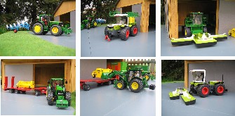 | Viel Farm und Diorama gibt es bei mir noch nicht zu sehen, da meine Modelle alle in der Vitrine unter-gebracht sind. Aber um am Wettbewerb teilnehmen zu können, wurde kurzerhand eine Maschinenhalle in 20 Stunden mit Vorplatz und Grünfläche gebaut. Mein Hobby: Angefangen hat es vor 4 Jahren, als ich erfuhr, dass mein Schwager Siku sammelt. Daraufhin wurden die Spielsachen aus meiner Kindheit (Britains Landmaschinen) gesucht. Da diese aber sehr schwer zu finden waren, habe ich bald auf Siku Farmer umgestellt. |