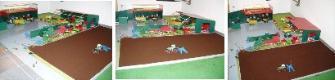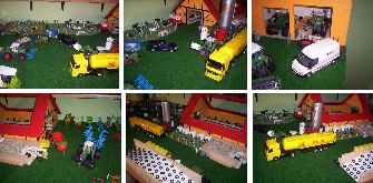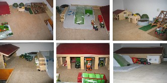 | Ich bin 36 Jahre, habe vor 15 Jahren meine Britains-Modelle aus der Kindheit wieder ausgegraben und mit dem Sammeln angefangen. Vor etwa 6 Jahren ent-stand der abgebildete Hof. Wichtig war mir, dass mein Sohn mit den Sachen auch tatsächlich spielen kann. Es ist also ein Kompromiss zwischen Aussehen und Haltbarkeit, bzw. Spielwert. Außerdem kann man die Sachen gut abbauen und ordentlich verstauen. Durch die Fertigteile (Schuppen,Wohnhaus) war es nicht so viel Arbeit den Hof zu erstellen. Arbeit machte u.a. die später hinzugefügte Wiese, da mehr auf Details etc. geachtet wurde. |