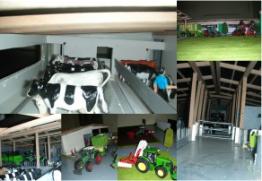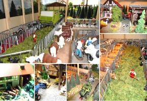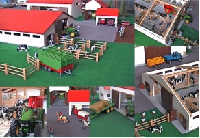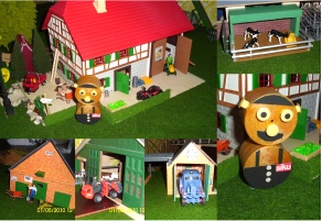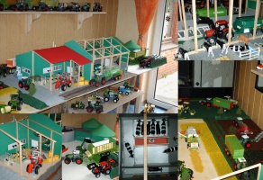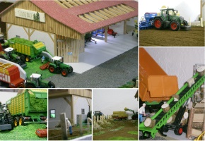 ![]() | Eigentlich wollte ich für meinen Sohn Ricardo eine Scheune und einen Stall bauen, da die Gebäude die es zu kaufen gab nicht meinen Vorstellungen entsprachen. Also begann ich zu basteln. Es war sehr viel Zeit notwendig, letzendlich teurer aber eben so wie es sein soll. Wir haben jetzt eine kleine Scheune, eine große Maschinenhalle und einen Kuhstall mit Schiebetoren die auf Rollen laufen, Türen und Gatter die sich öffnen und schliessen lassen. Der Stall hat Trennwände, einen Futterautomat, Tränken, "automatische" Bürsten und Boxentrenngitter. Dazu kam auch noch eine Garage mit Kipptor und eine Doppelgarage mit Schwingtor. Sämtliche Dächer sind abnehmbar. Vor kurzem haben wir noch ein Fahrsilo gebaut. Mit den Fahrzeugen, Tieren und Figuren wirkt das Ganze schon ziemlich echt und ist zum Spielen fast schon zu schade. Grüße aus Lonsee bei Ulm |